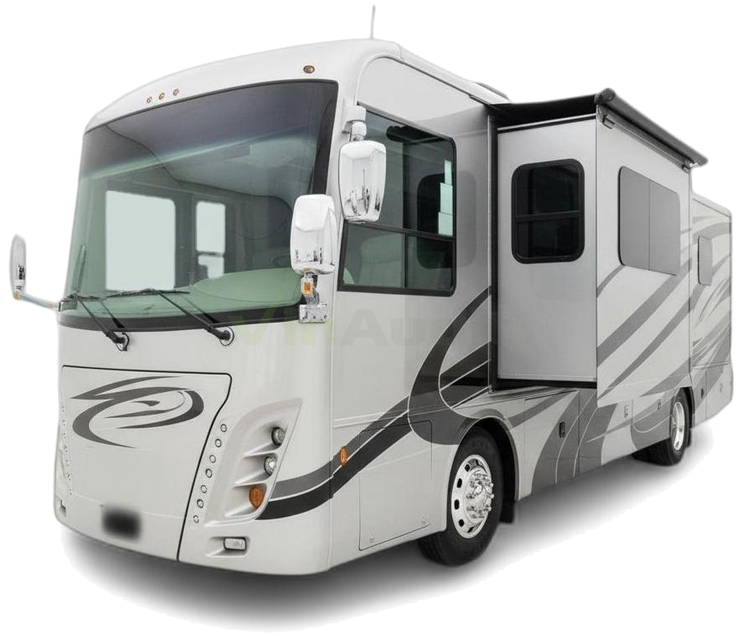 - Exteriors: High-gloss full-body paint, large basement storage compartments, power awnings, exterior entertainment centers.